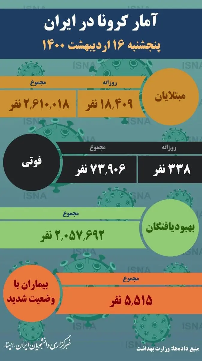 آمار کرونا/پنجشنبه ۱۶ اردیبهشت ۳۳۸ فوتی جدید کرونا در کشور و ۲۴۴۱ تن دیگر بستری شدند. پایگاه خبری تحلیلی نامه نیوز (namehnews.com) : آنچه دیگران می خوانند خبر فوری تعطیلی مدارس فردا ۸ دی | مدارس این استان ها تعطیل شد این خطا باعث قطع سود سهام عدالت میشود | شرط مهم برای دریافت سود کلیک کنید موشک های ایران نامرئی می شوند خبرنامه آمار پنجشنبه کرونا اردیبهشت فوتی خبر فوری تعطیلی مدارس فردا ۸ دی | مدارس این استان ها تعطیل شد لینک کپی شد