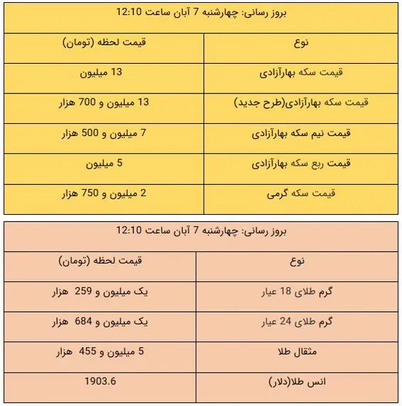 نرخ طلا و سکه در بازار امروز ۷ آبان ۹۹ + جدول