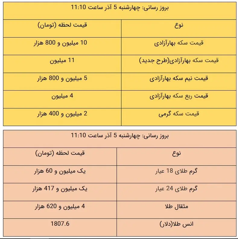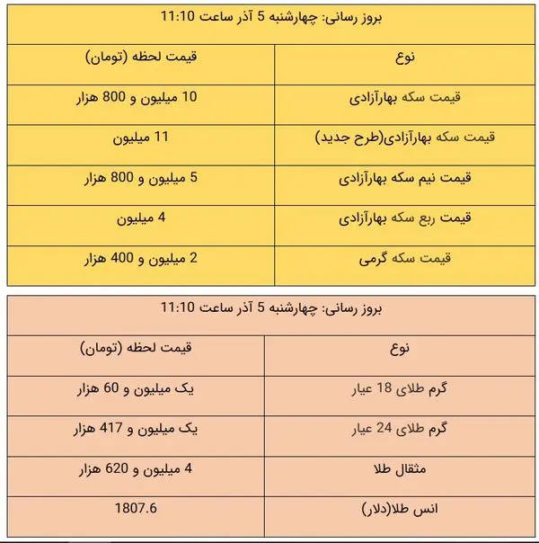 قیمت طلا و سکه امروز ۵ آذر ۹۹ / سکه در مرز ورود به کانال ۱۰ میلیونی + جدول