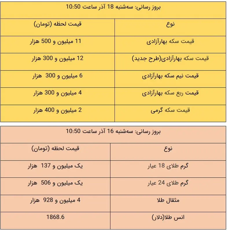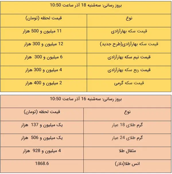 قیمت طلا و سکه امروز ۱۸ آذر ۹۹ + جدول