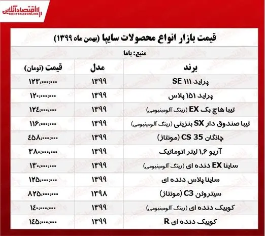 قیمت خودروهای سایپا (۹۹/۱۱/۱۲) + جدول