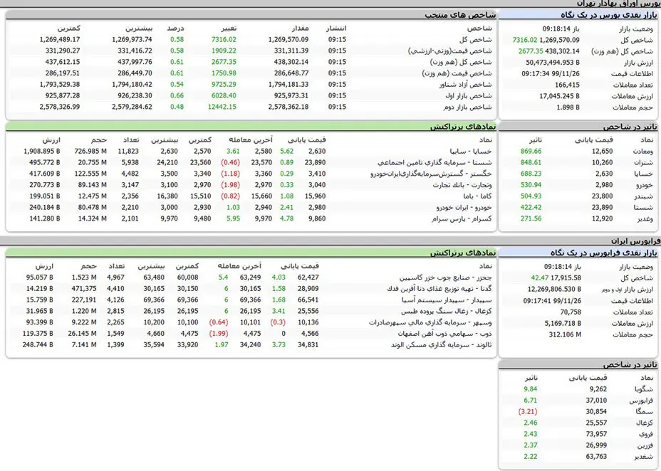 شاخص کل بورس تهران در این لحظه در ارتفاع یک میلیون و 269 هزار واحد قرار گرفته است. شاخص کل هم وزن هم در ارتفاع 438 هزار واحدی با رشد همراه شد.