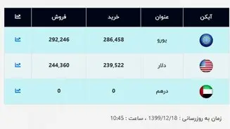 قیمت یورو نیز برای فروش ۲۹۲۲۴۶ در صرافی ملی ریال اعلام شده؛ نرخ خرید یورو نیز در این صرافی ۲۸۶۴۵۸ ریال نرخ خورده است.