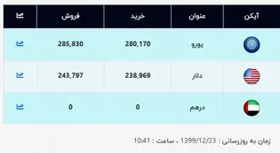 قیمت یورو نیز برای فروش ۲۸۵۸۳۰ در صرافی ملی ریال اعلام شده؛ نرخ خرید یورو نیز در این صرافی ۲۸۰۱۷۰ ریال نرخ خورده است.