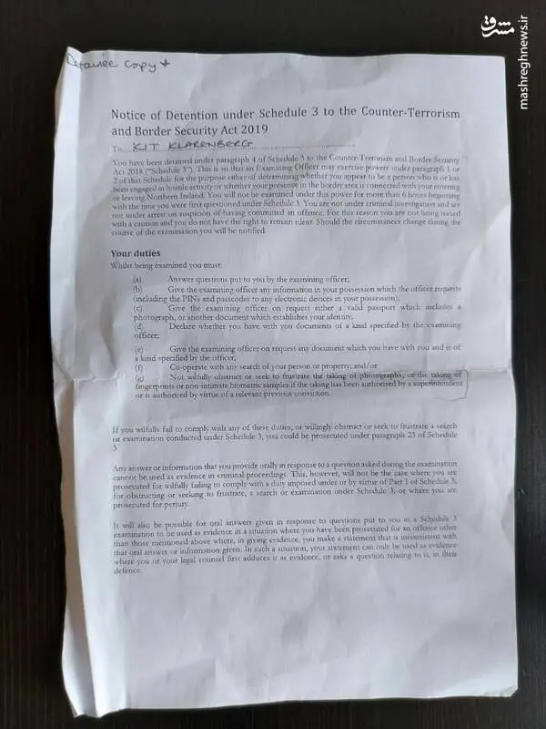پلیس ضد تروریسم انگلیس با متهم کردن روزنامهنگاری به نام کیت کلارنبرگ، وی را در بدو ورود به لندن بازداشت کرد.