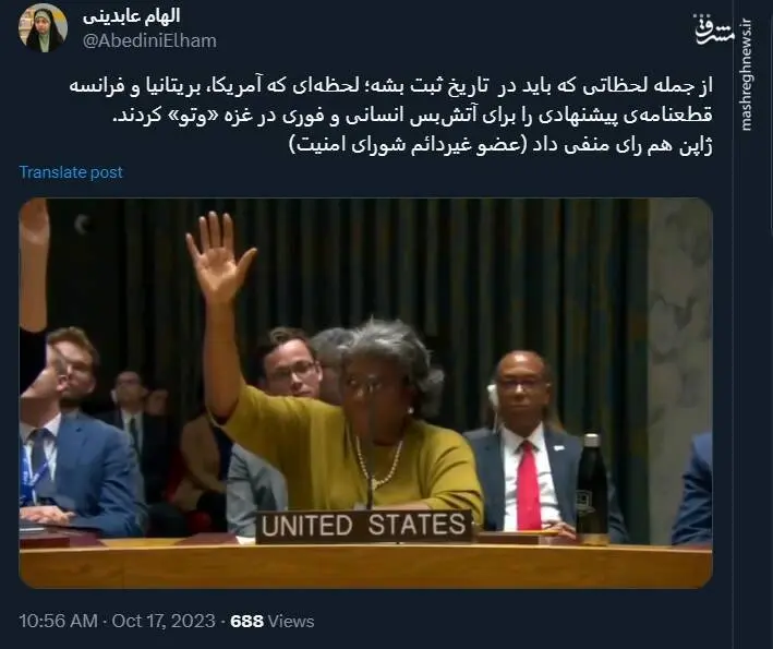 از جمله لحظاتی که باید در تاریخ ثبت بشه؛ لحظهای که آمریکا، بریتانیا و فرانسه قطعنامهی پیشنهادی را برای آتشبس انسانی و فوری در غزه «وتو» کردند. ژاپن هم رای منفی داد (عضو غیردائم شورای امنیت)