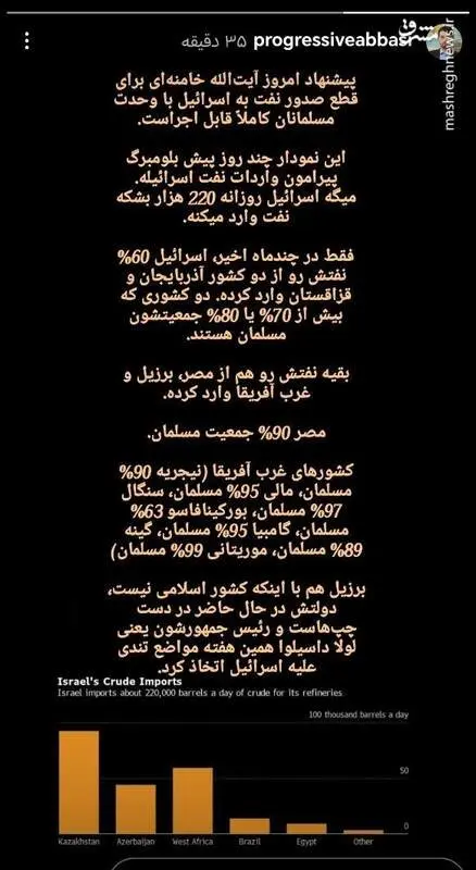 پیشنهاد امروز آیت الله خامنه ای برای قطع صدور نفت به اسرائیل با وحدت مسلمانان کاملا قابل اجراست.