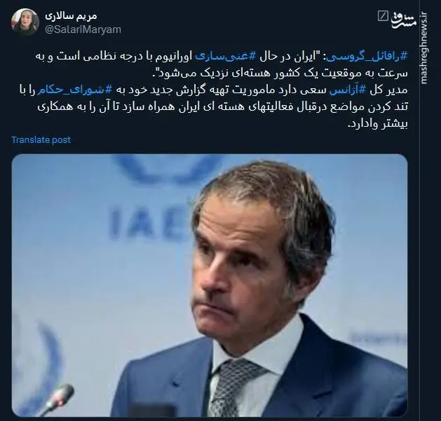 رافائل گروسی: "ایران در حال غنیسازی اورانیوم با درجه نظامی است و به سرعت به موقعیت یک کشور هستهای نزدیک میشود".