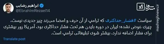 سیاست فشار حداکثری که ترامپ از آن حرف و امضا میزند چیز جدیدی نیست، چیزی عوض نشده؛ ایران در دوره بایدن هم تحت فشار حداکثری بود، آمریکا زور بیشتری برای فشار اضافه ندارد، بیشتر شوی تبلیغاتی ترامپ است.