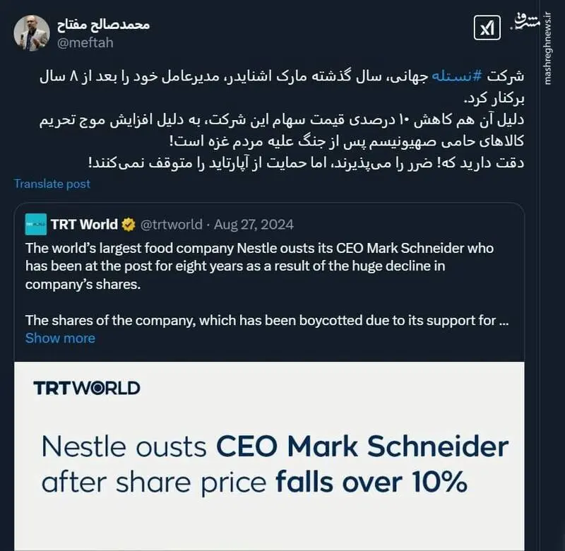 دلیل آن هم کاهش ۱۰ درصدی قیمت سهام این شرکت، به دلیل افزایش موج تحریم کالاهای حامی صهیونیسم پس از جنگ علیه مردم غزه است!