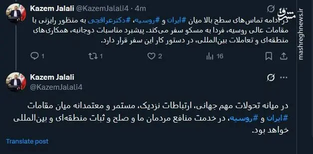 به گزارش مشرق،جلالی، سفیر جمهوری اسلامی ایران در فدراسیون روسیه در توئیتری نوشت: