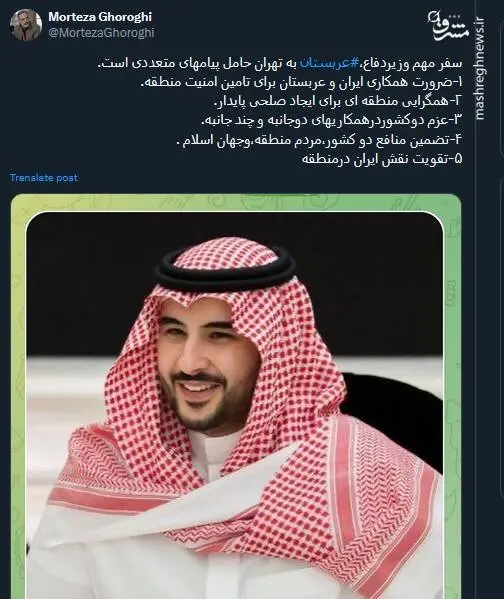 به گزارش مشرق،مرتضی غرقی در توئیتری پیرامون سفر وزیر دفاع عربستان به تهران نوشت: