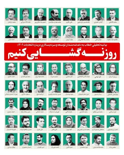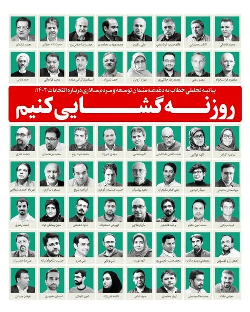 ۱۱۰ فعال مدنی و سیاسی و چهرههای روشنفکری و اصحاب رسانه که در میان آنان تعدادی از اصلاحطلبان حضور دارند در بیانیهای تحلیلی خواستار روزنهگشایی احزاب و نیروهای سیاسی و مدنی در انتخابات مجلس ۱۴۰۲ از طریق حمایت از ائتلافی از نامزدهای میانهرو، توسعهگرا و اصلاحگر شدند.