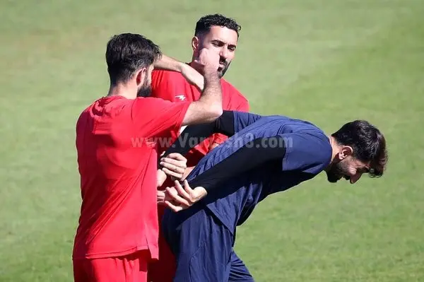 با این حال علیرضا بیرانوند که همیشه با دیگر بازیکنان شوخی میکند این بار خودش هدف دیگر ستارهها قرار داشت. در حاشیه تمرین درحالی که بیرانوند با پای زخمی در زمین چمن حضور پیدا کرده بود، قدوس و قلی زاده دستهایش را از پشت گرفتند تا به پشت او ضربه بزنند.