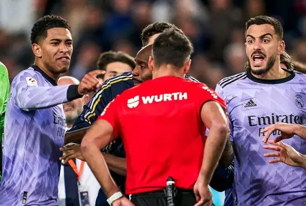 وینیسیوس هم در وسط دعوا و آشفتگی است و آنچلوتی با عصبانیت خوسلو را از بحث با مانسانو بیرون می کشد. مربی به همراه چند نفر دیگر از داور توضیح می خواهد.