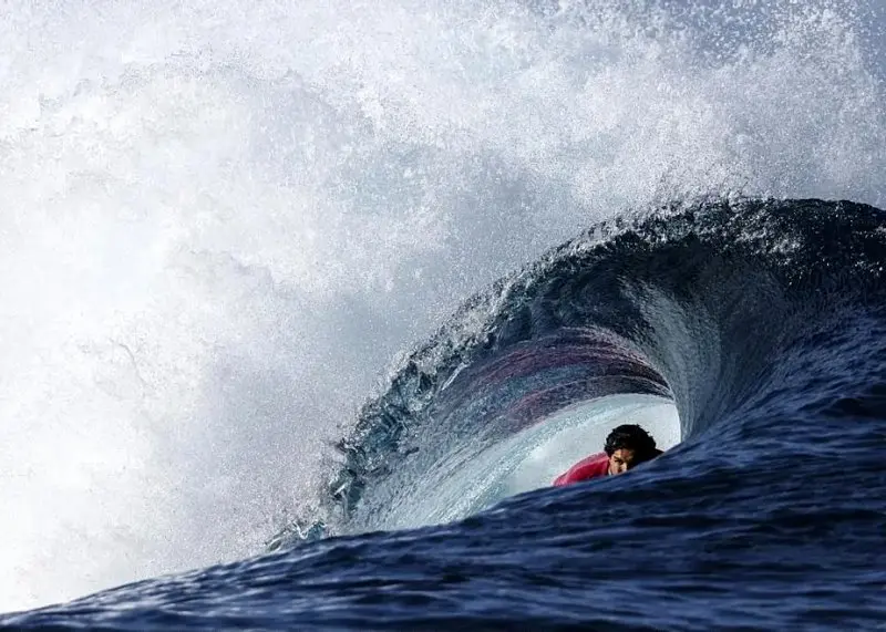موج سوار برزیلی، گابریل مدینا، در 15000 کیلومتری پایتخت فرانسه، در تاهیتی، بر فراز آبها انگشت اشاره خود را به نشانه پیروزی بالا میبرد. عکاس ژروم برول این لحظه خاص را ثبت و بلافاصله آن را به یک تصویر نمادین تبدیل کرد.