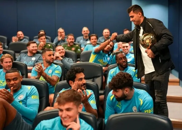 به گزارش "ورزش سه"، آخرین تمرین سیتی یک مهمان ویژه داشت. رودری، برنده توپ طلای 2024، در رختکن سیتی حاضر شد و از جایزه خود نزد همتیمیهایش رونمایی کرد.