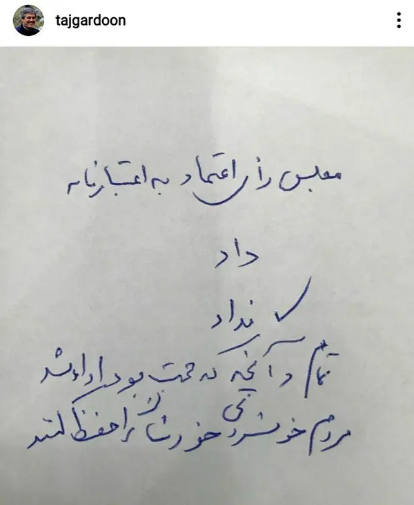 اولین واکنش صریح تاجگردون پس از رد شدن اعتبارنامهاش در مجلس + پست اینستاگرام