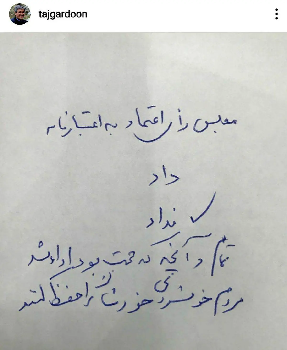 به گزارش نامه نیوز، غلامرضا تاجگردون، منتخب مردم گچساران در مجلس که اعتبارنامه او پس از کش و قوس های فراوان، امروز در صحن مجلس رد شد، در پست جدید اینستاگرامی خود نوشت: مجلس رای اعتماد به اعتبارنامه نداد، تمام و آنچه که حجت بود، ادا شد. مردم خونسردی خودشان را حفظ کنند.