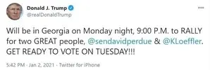 رئیسجمهور کنونی آمریکا در این باره نوشت که دوشنبه شب در جورجیا در کارزار انتخاباتی برای حمایت از دو کاندیدای سنا در آستانه انتخابات پنجم ژانویه حاضر خواهد شد.