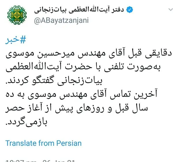 صفحه توئیتر دفتر آیت الله بیات زنجانی اعلام کرد: «دقایقی قبل آقای مهندس میرحسین موسوی بهصورت تلفنی با حضرت آیتاللهالعظمی بیاتزنجانی گفتگو کردند.