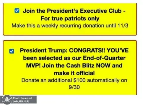 برای مثال یکی از حامیان ترامپ، در ماه سپتامبر گذشته 500 دلار به او کمک کرد اما تا ماه اکتبر، هر هفته 500 دلار از حساب او کسر می شد. یکی دیگر از حامیان رئیس جمهور آمریکا 990 دلار به او کمک کرده بود اما مبلغ نهایی که از حساب او کسر شده بود به 8000 دلار رسید.