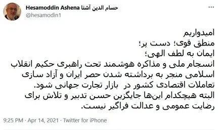 به گزارش نامه نیوز، حسام الدین آشنا، مشاور رییس جمهور در توییتر نوشت: