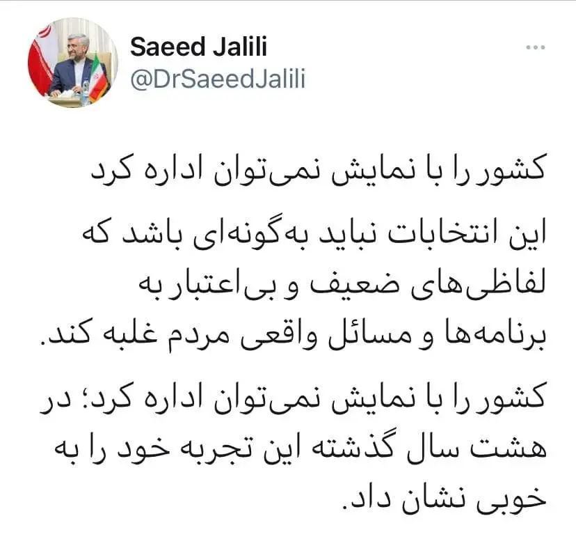 سعید جلیلی در توئیتی نوشت: کشور را با نمایش نمیتوان اداره کرد؛ در هشت سال گذشته این تجربه خود را به خوبی نشان داد.