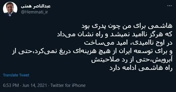 عبدالناصر همتی در توییتر نوشت: هاشمی برای من چون پدری بود که هرگز ناامید نمیشد و راه نشان میداد در اوج ناامیدی، امید میساخت و برای توسعه ایران از هیچ هزینهای دریغ نمیکرد،حتی از آبرویش،حتی از رد صلاحیتش راه هاشمی ادامه دارد.