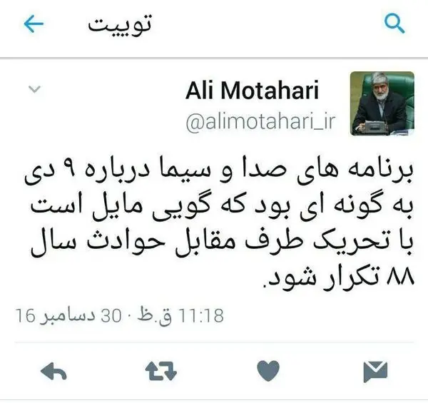 انتقاد توییتری مطهری از برنامههای صداوسیما در ۹دی: گویا تمایل داشتید حوادث سال ۸۸ تکرار شود