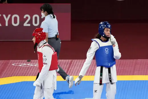 کیمیا علیزاده تکواندوکار ایرانی تیم پناهجویان که در المپیک قبلی با پیراهن تیم ملی ایران به مدال برنز رسیده بود در آوردگاه توکیو از رسیدن به سکو و کسب مدال باز ماند و اینگونه با سالن مسابقات خداحافظی کرد. منبع: همشهری