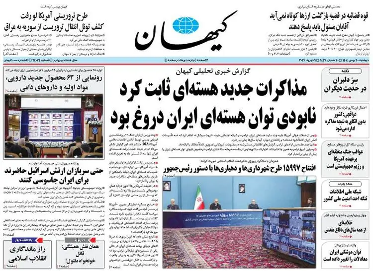 مذاکرات جدید هستهای ثابت کرد نابودی توان هستهای ایران دروغ است، چرخش ناگزیر، سکولاریسم جعفر، میخواهیم زندگی کنیم، زن بردگی رسوایی و...از جمله تیترهای روزنامههای دوشنبه ۲۰ بهمن ۱۴۰۴ هستند.