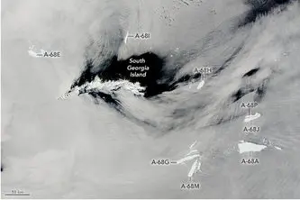 در یک عکس ماهوارهای که در تاریخ ۱۱ فوریه ۲۰۲۱ گرفته شده، خطوط ناهموار ۱۱ کوه یخ شکسته در اطراف یک جزیره دور افتاده و پر از پنگوئن به نام "جورجیای جنوبی"(South Georgia) واقع در حدود ۱۵۰۰ کیلومتری شمال شرقی شبه جزیره جنوبگان قرار دارد.