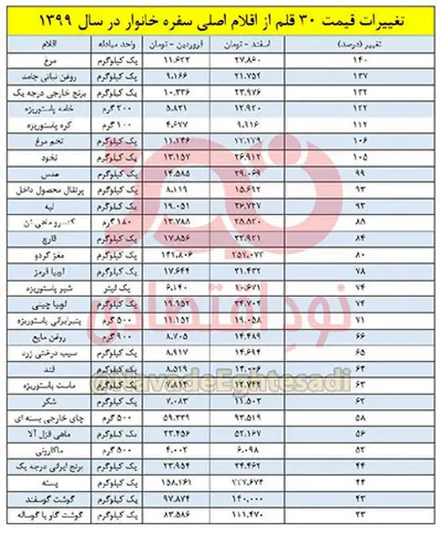 بررسی قیمت ۳۰ قلم از اقلام عمده سفره خانوار در سال ۹۹ نشان میدهد طی اول فروردین تا پایان اسفندماه سال ۹۹ قیمت این ۳۰ قلم بهطور میانگین ۸۰ درصد رشد داشته است.