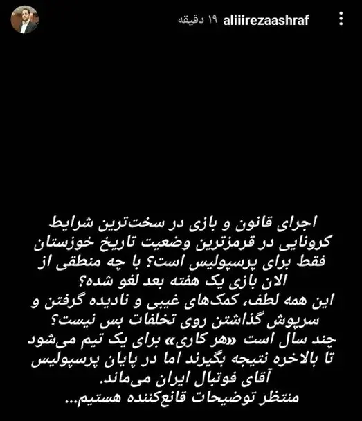 این موضوع با واکنش های مختلفی همراه بود و علیرضا اشرف، مدیر رسانه ای پرسپولیس هم در این خصوص یک استوری منتشر کرد: