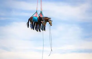 عکس جالب از انتقال ۳ اسب صدمه دیده با هلی کوپتر