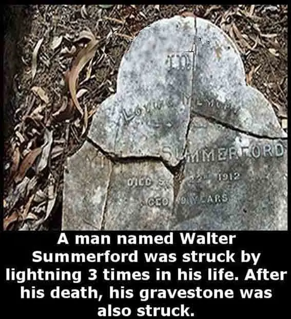 شخصی به نام والتر سامرفورد در طی زندگیش سه بار مورد اصابت صاعقه قرار گرفت و بعد از مرگش نیز سنگ قبر او مورد اصابت صاعقه قرار گرفت.