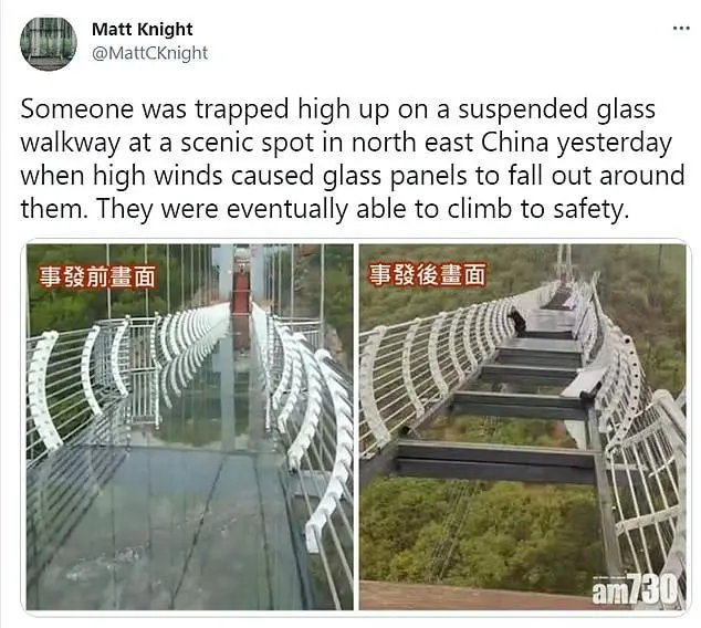 توریستی پس از شکسته شدن شیشه پل تفریحی در کوه پیان در شهر لونجینگ آویزان ماند. :small_orange_diamond:شیشه پل توریستی با ارتفاع 330 فوت با وزش باد شدید با سرعت 90 مایل شکسته شد و مردی وحشت زده برای حفظ جان به نرده چسبید.