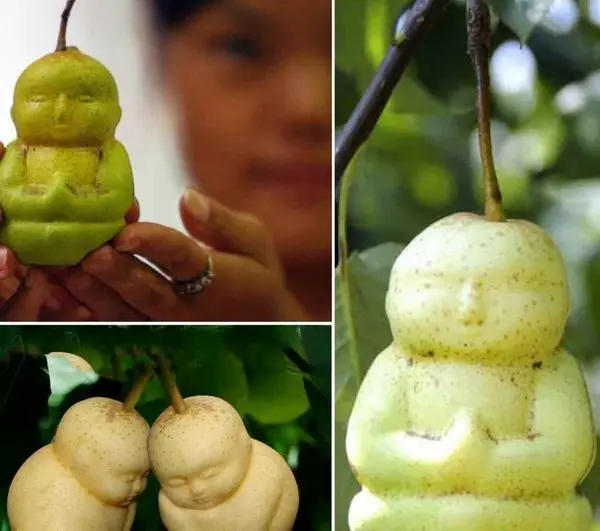 گلابی بودایی! یک باغدار چینی با قالبهایی که از ابتدای رشد میوه استفاده شده تونسته در باغش گلابیهای شبیه مجسمه بودا پرورش بده!