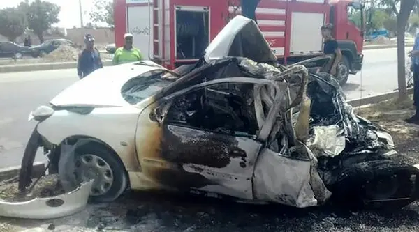 به دنبال تصادف یک خودروی سواری با کامیون، سواری پژو ۲۰۶ دچار آتشسوزی و انفجار شد.