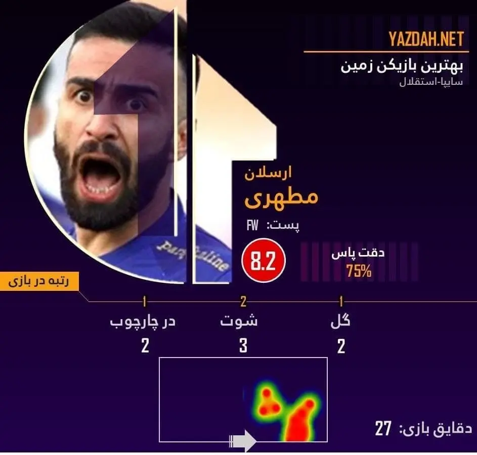 ارسلان مطهری با دو گلی که وارد دروازه سایپا کرد، عنوان بهترین بازیکن زمین را به خود اختصاص داد.