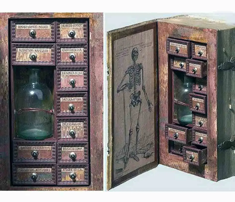 داخل هر کشو شیشه ای وجود دارد که در داخل هر کدام از این شیشه ها شاخه هایی از گیاهان سمی و سموم که برای کشتن و درمان افراد توسط پزشکان قرون وسطی به کار می رفتند، وجود دارد. بر روی هر کشو نیز برچسبی زده شده است که کاربرد گیاه مورد نظر را مشخص می کند.