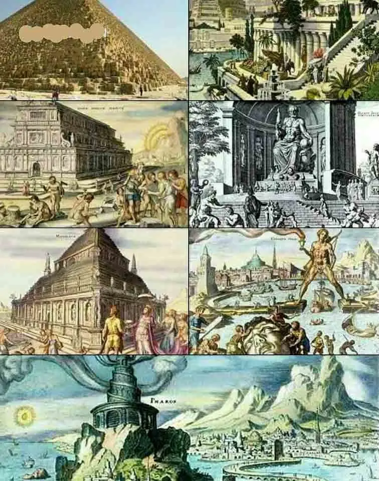 عجایب هفتگانه قدیم از چپ به راست بالا به پایین: هرم بزرگ جیزه، باغهای معلق بابل، نیایشگاه آرتمیس، تندیس زئوس، آرامگاه هالیکارناسوس، تندیس غول پیکر رودس و فانوس دریایی اسکندریه
