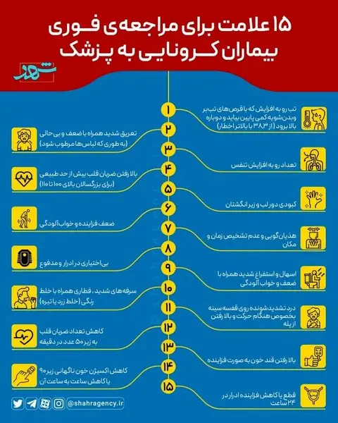 با ۱۵ علائم خطرناک ویروس کرونا در بدن که نیاز فوری به درمان دارد را بشناسید.منبع:خبرگزاری شهر