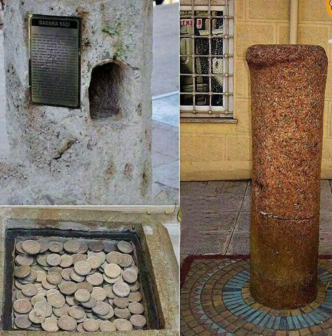 در زمان قدیم صندوق صدقات به شکل ستون سنگی بود! این صندوق‌ها حفره‌ای داشتند که دست در آن فرو می‌رفت و مشخص نبود که از آن پول برمی‌دارند یا پول می‌گذارند و آبروی محتاج حفظ می‌شد.