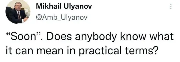 میخائیل اولیانوف نماینده روسیه در سازمانهای بینالمللی واقع در وین، با انتشار توئیتی به اظهارات امیر حسین امیرعبداللهیان وزیر امور خارجه کشورمان واکنش نشان داد و نوشت: «بزودی»؛ کسی میداند این واژه به صورت عملی به چه معناست؟ گفتنی است، این دومین بار در هفتههای اخیر است که نماینده روسیه نارضایتی خود از مواضع ایران در قبال مذاکرات نشان میدهد. در جریان ملاقات امروز خسرو ناظری دبیرکل جدید سازمان همکاری اقتصادی (اکو) با حسین امیر عبداللهیان، وزیر امور خارجه کشورمان به گفتگوهای اخیر با اتحادیه اروپایی در تهران و ادامه آن در بروکسل اشاره کرد و افزود: به زودی مذاکرات هستهای با ۴+۱ از سر گرفته خواهد شد.