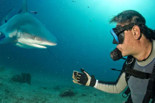 مرد غواص با به جان خریدن خطر، یک قلاب را از میان دندان های کوسه ابریشمی رها می کند. منبع: چندثانیه