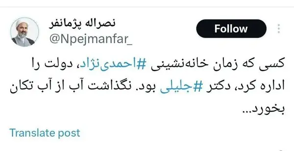 نامه نیوز - نصرالله پژمانفر، نماینده مشهد در مجلس دوازدهم و یکی از اعضای جبهه پایداری در شبکه اجتماعی ایکس مدعی شد: کسی که زمان خانه نشینی احمدی نژاد، دولت را اداره کرد، دکتر جلیلی بود. نگذاشت آب از آب تکون بخورد...