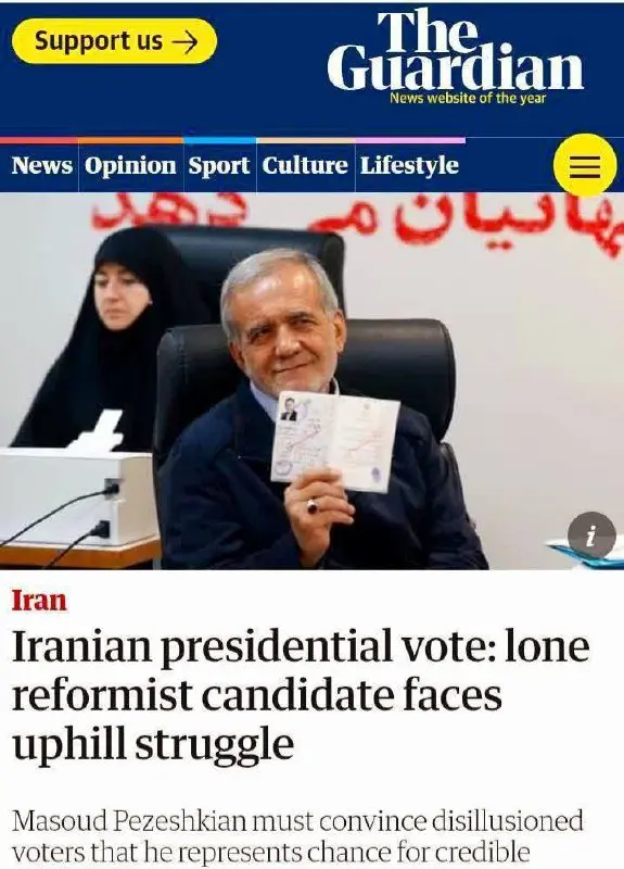 گاردین پزشکیان را عکس کرد و نوشت: تنها نامزد انتخابی اصلاح طلب با مبارزه سختی روبروست
