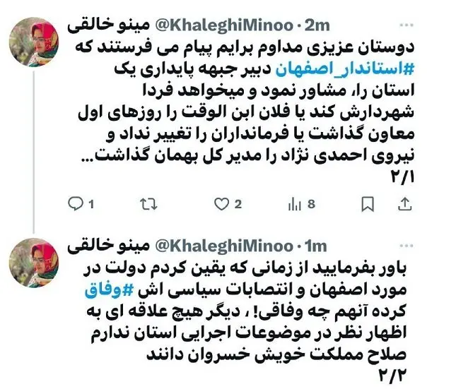 مینو خالقی، فعال سیاسی اصلاحطلب در شبکه اجتماعی ایکس با اشاره به سپردن برخی مناصب به طیف پایداری از عملکرد استاندار جنجالی اصفهان انتقاد کرد.